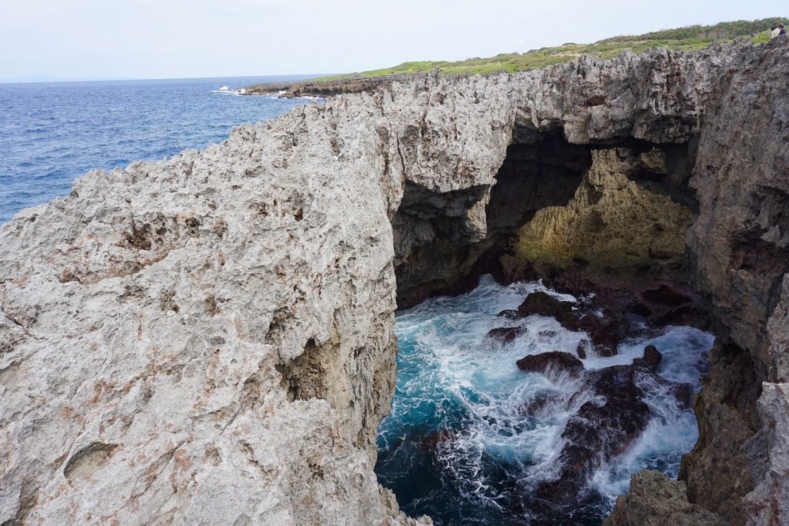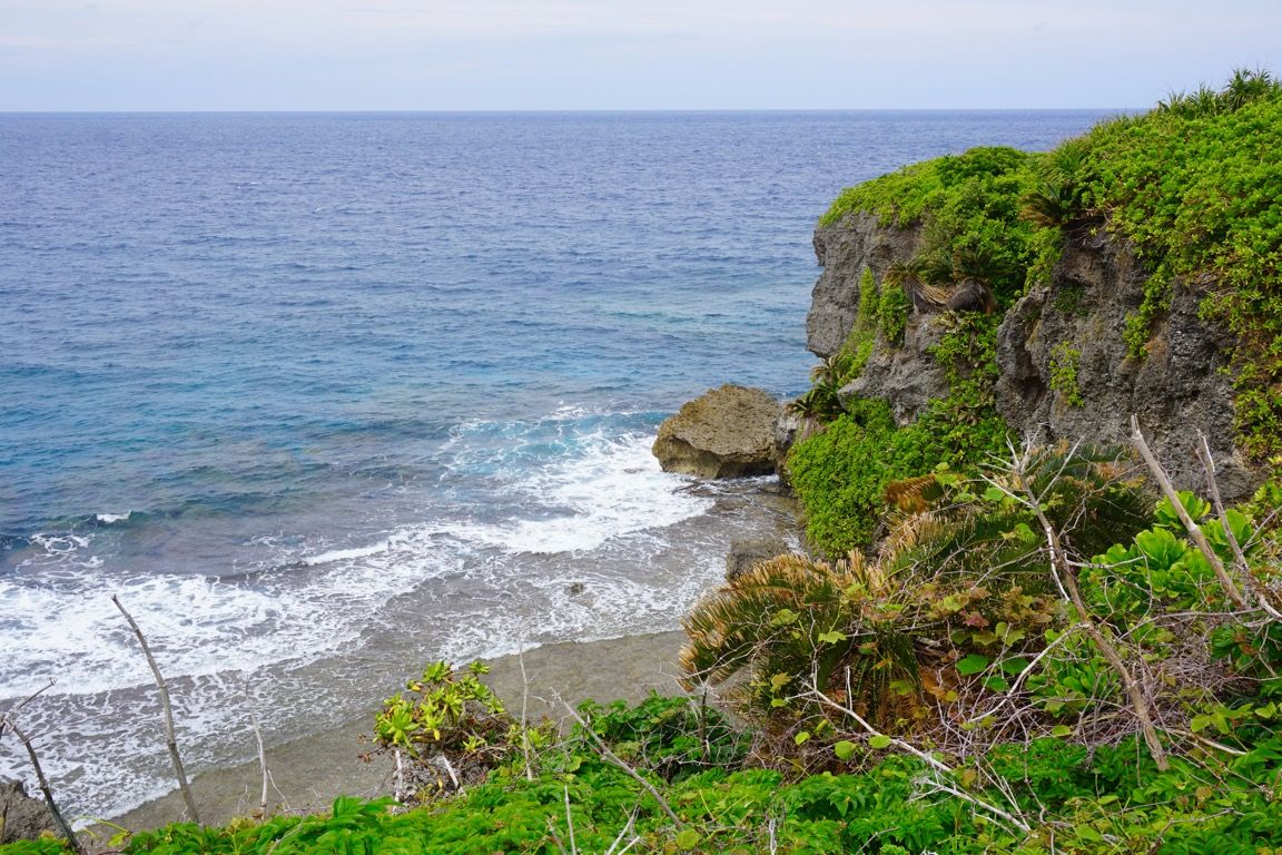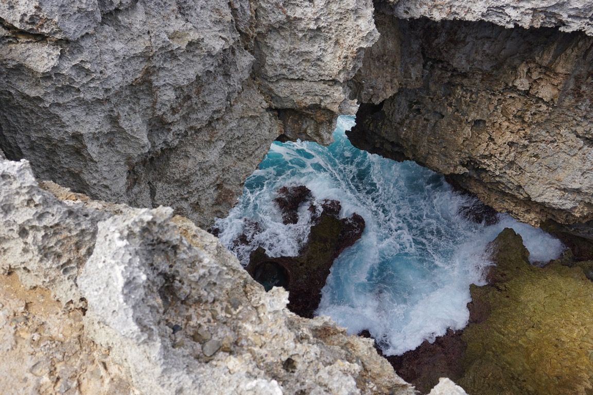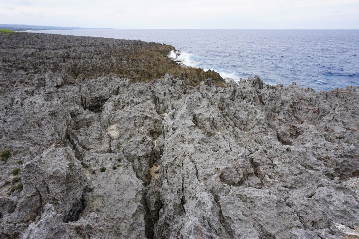 周囲を見渡すと、奇岩が一面に広がっている。無数の棘が地面から突き出しているかのような、荒々しくも不思議な地形である。海岸では、その岩々に砕かれた波が絶えず白いしぶきを上げている。岩に目を凝らすと、貝殻の化石のようなものが取り込まれているのがわかる。かつて海の中にあったサンゴ礁が、長い年月を経て石灰岩となり、やがて隆起してこの島を形づくってきたというそんな時間の積み重なりが、ここには確かに刻まれている。