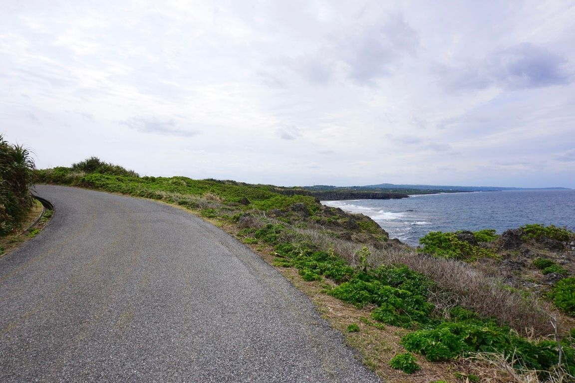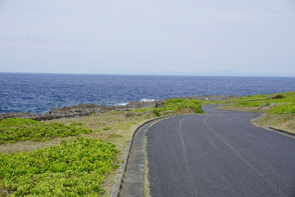 海岸線に沿う道は、地形に合わせて緩やかにカーブしながら、上り下りを繰り返していく。ふと振り返ると、島の北側の海岸線が遠くまで続いているのが見えた。海へと突き出す半島のような稜線の先端こそ、前日にデマンドバスで訪れた田皆岬である。