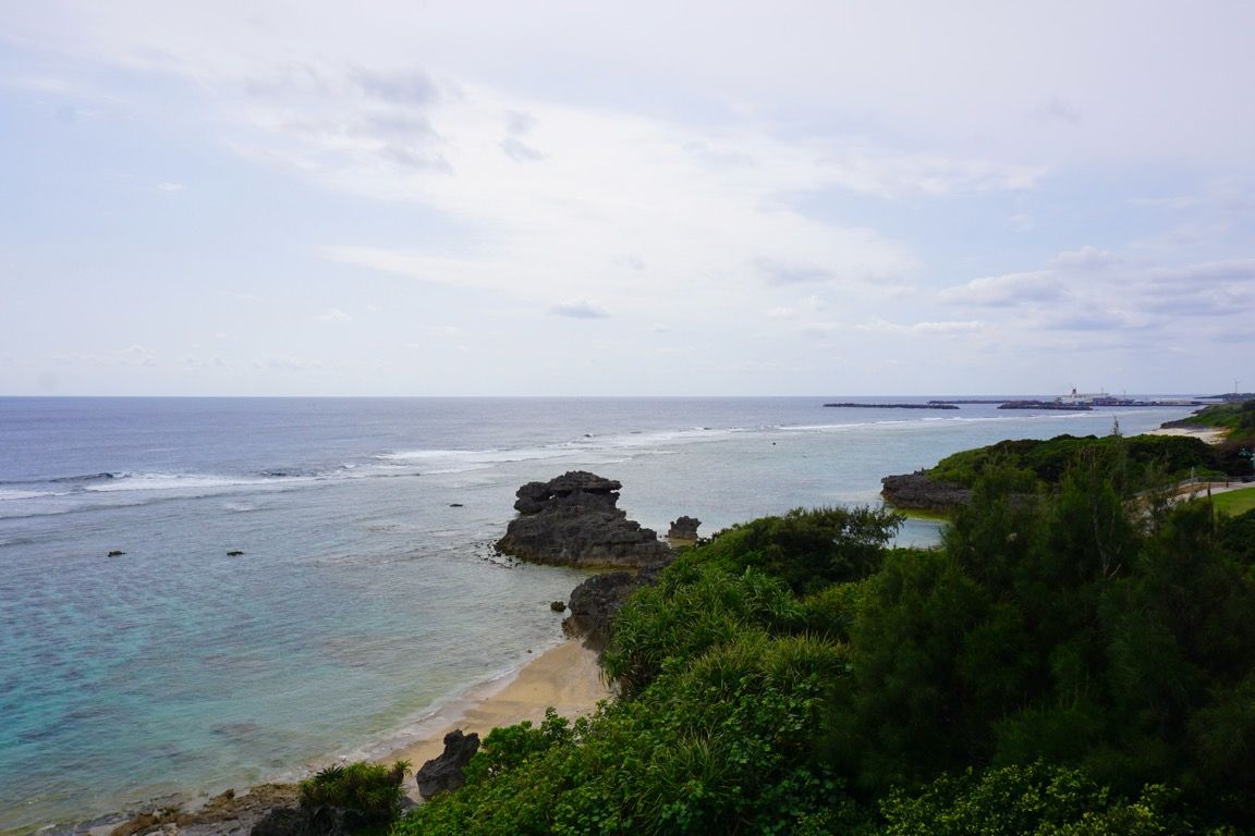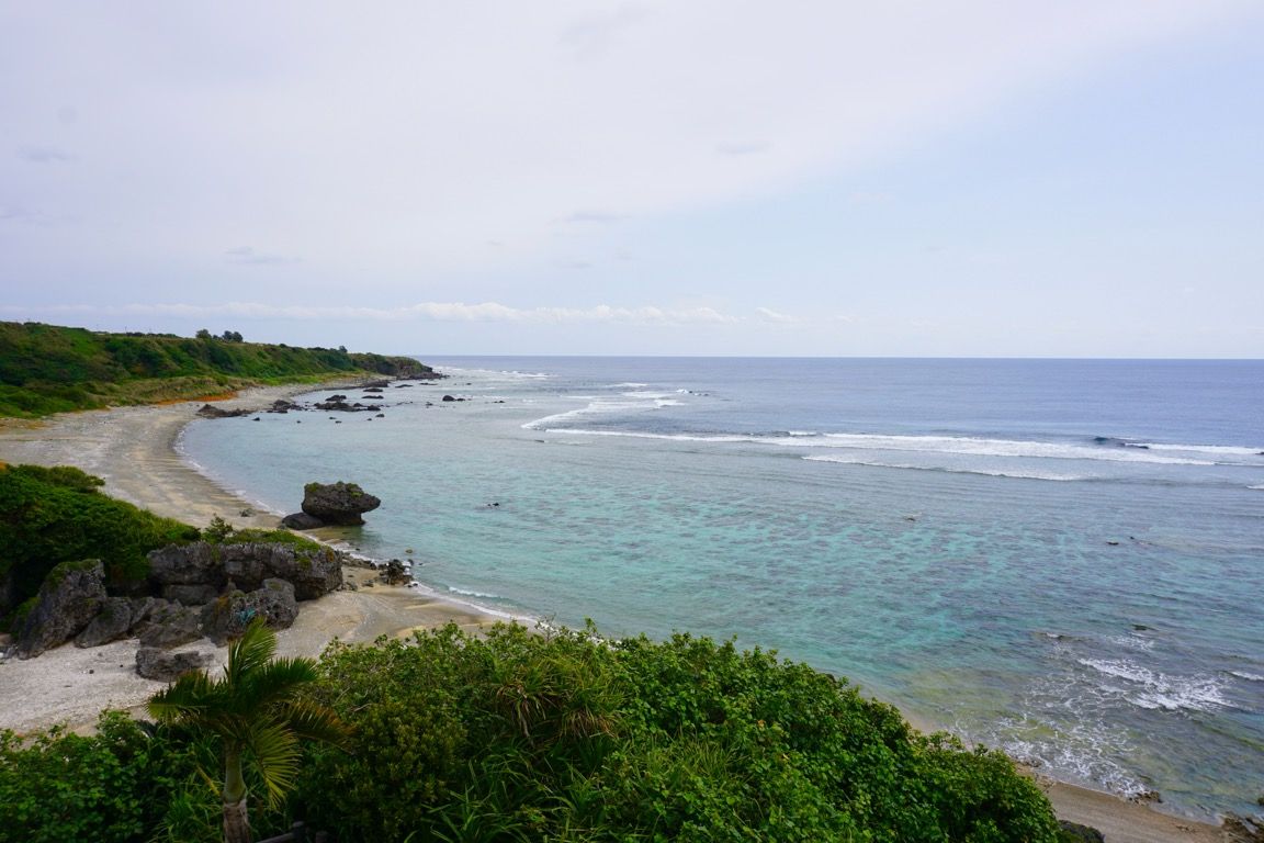 展望台に登ると、公園や周辺の海岸線を一望することができた。午前中は天気に恵まれていたが、午後にかけては雲が広がる予報となっていたこの日の沖永良部島。予報通り、次第に雲が湧き始めていた。澄み渡る青空と珊瑚の海という光景にはならなかったものの、それでも目の前に広がるエメラルドグリーンの海岸線は十分に美しく、しばらくその景色に見入ってしまった。