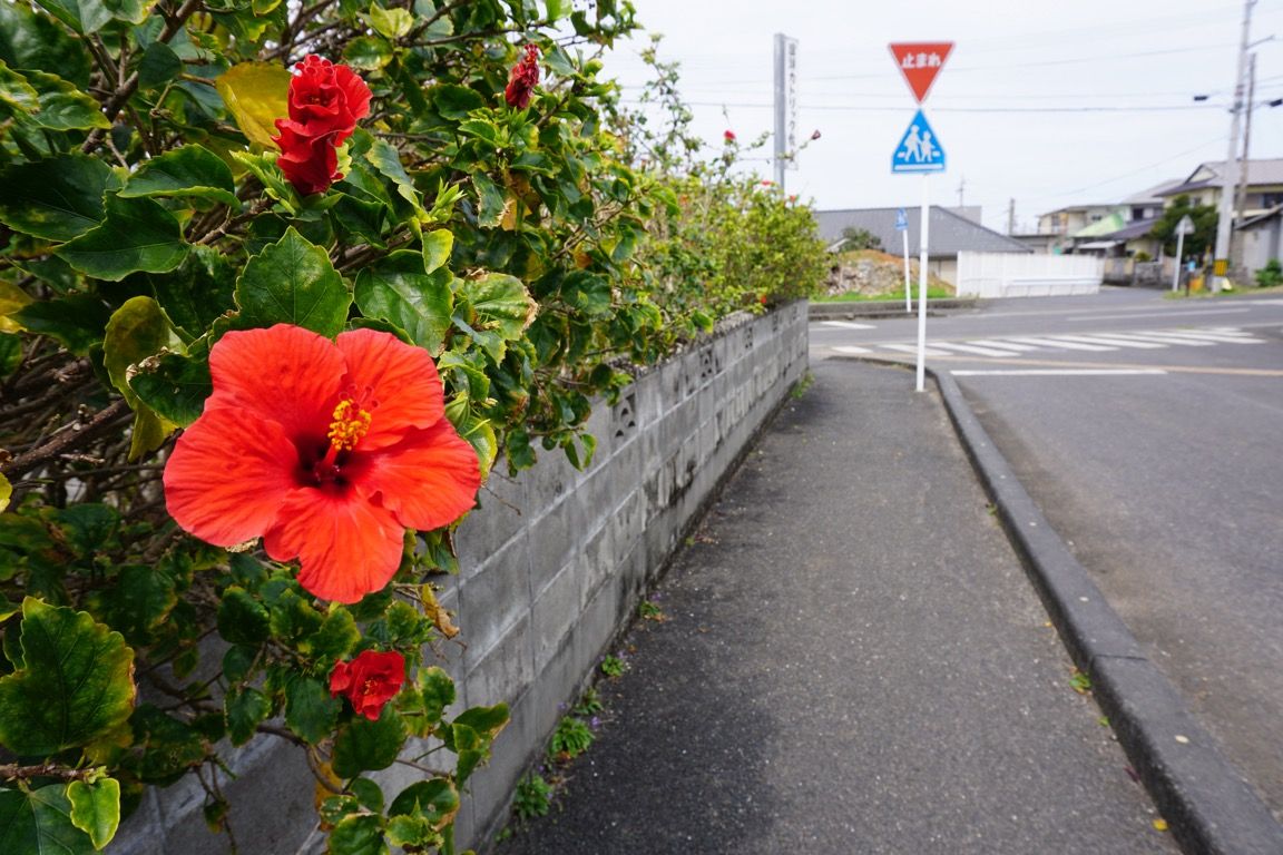 国頭小学校に立ち寄り、日本一のガジュマルを見学した後は、海岸沿いにある「フーチャ」という景勝地を目指す。ここから空港へは、このフーチャを経由しながら歩いて向かう。まずは来た道を戻り、国頭の集落の中を歩いていく。沿道の教会の植え込みにはハイビスカスが花を咲かせており、穏やかな日常の風景の中に、ささやかな南国の気配が漂っていた。