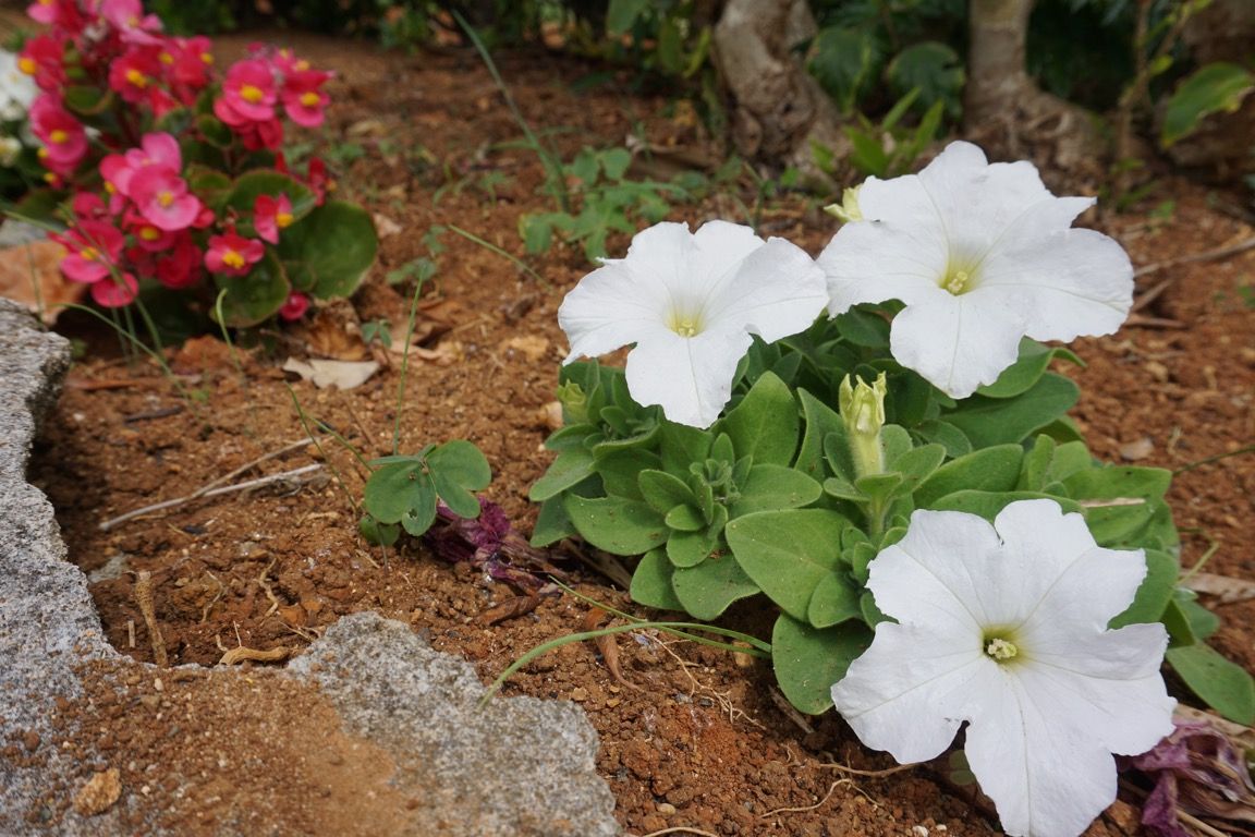お弁当を食べ終え、バスの時間が近づいてきたので、バスを降りた場所へと戻る。ユリの花こそまだ咲いていなかったが、公園内の各所にはさまざまな花が咲いており、とても美しかった。花の名前はほとんどわからなかったため、AIで調べてみると、白い花はペチュニア、奥に咲く花はベゴニアというらしい。