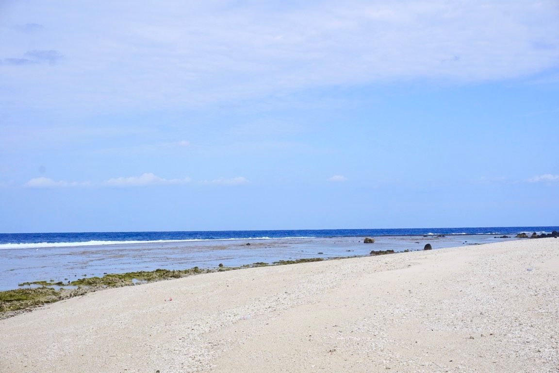 沖永良部空港の滑走路北端にほど近い場所までやってくると、白い砂浜が広がっているのが見えた。フーチャにいた頃は雲がやや厚かったが、次第に雲が薄くなり、隙間から太陽が顔をのぞかせる。亜熱帯らしい植物をかき分けて浜辺へ下りると、真っ白な砂浜が広がっていた。陽の光を受けて、海は再び青く輝き始める。その光景を、しばし腰を下ろして眺める。だが、その穏やかな時間も長くは続かず、やがて再び厚い雲が流れ込み、空を覆っていった。