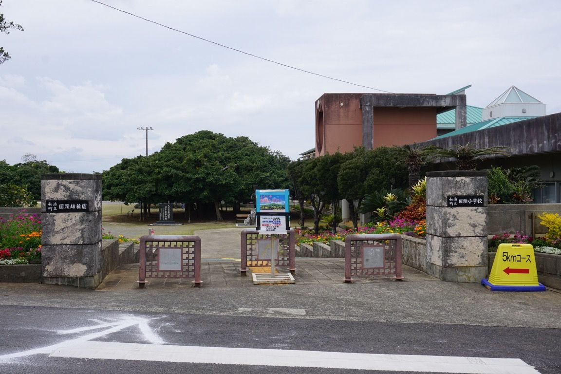 和泊町立国頭小学校は今も現役の小学校で、ホームページによれば2025年度の全校児童は67人だという。ここは現役の小学校でありながら、この島の観光スポットの一つとなっている。校庭に繁るガジュマルの木は「日本一のガジュマル」と呼ばれており、自由に見学できるようになっている。少し中へ入らせてもらい、ガジュマルの木を見学した。