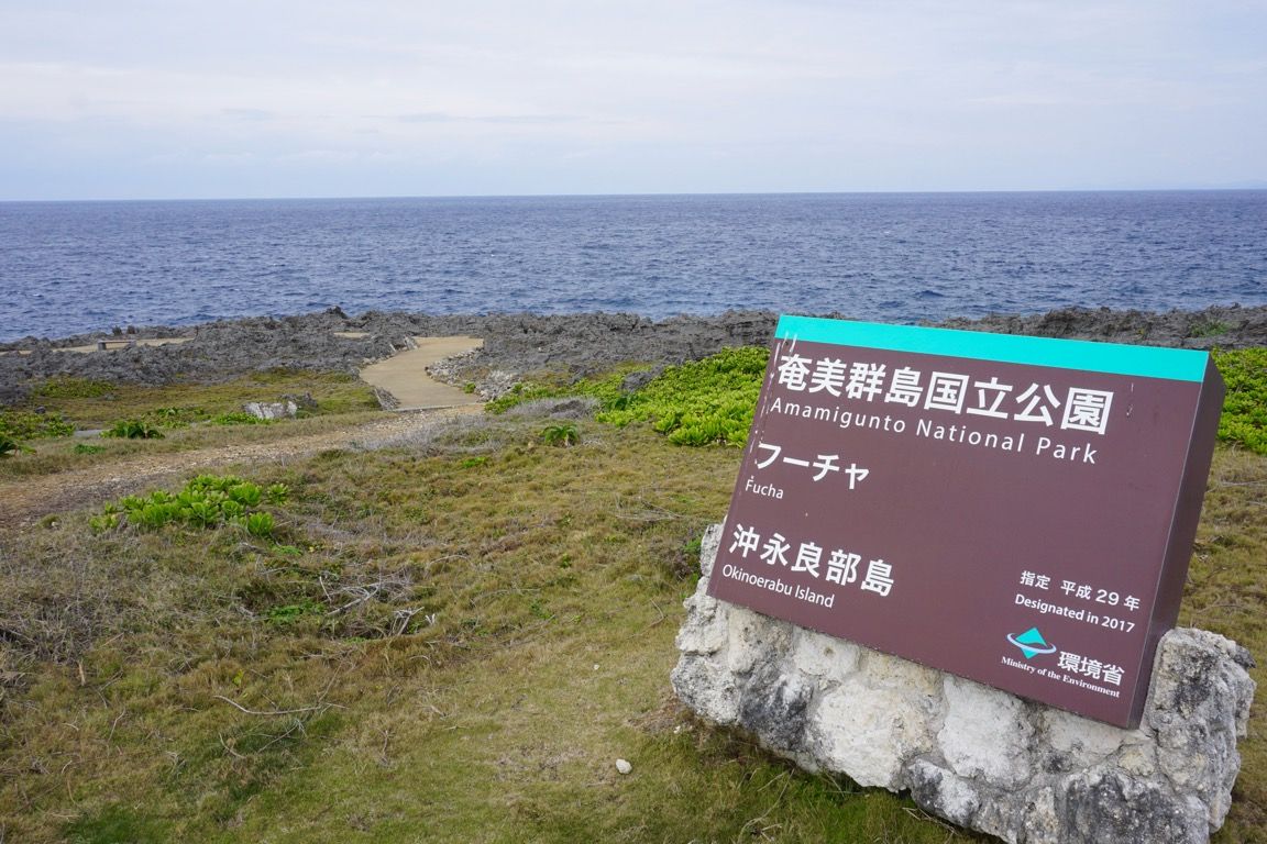 国頭小学校から20分ほど歩き、フーチャへと到着した。「フーチャ」とは潮吹き上げ洞窟を意味する。隆起したサンゴ礁が石化してできた石灰岩の荒々しい地形が続くこの一帯では、海の浸食によって岩に穴が開き、独特の景観を形づくっている。ここも奄美群島国立公園の区域に含まれており、それを示すモニュメントが設置されていた。