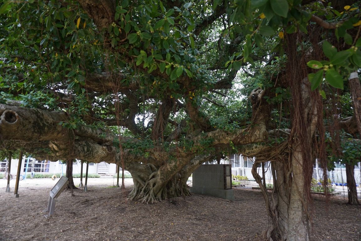 校舎と校庭の間に生い茂るガジュマルの木。この木は1898年にこの小学校の初代卒業生が植樹し、以後、在校生や地域の住民の手によって大切に守られてきた。入口の説明によれば、樹冠(枝ぶり)と樹影(木によって影になる面積)が日本一と言われているとのこと。枝ぶりは22mを超えるといい、もはや大きな建物のようにも見える。これまで台風や干ばつの影響で危機的な状況もたびたびあったそうだが、そのたびに手入れが行われ、ここまで大きく育ってきたという。