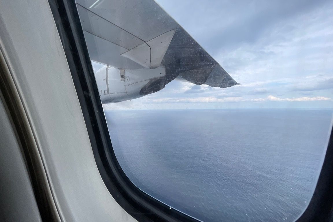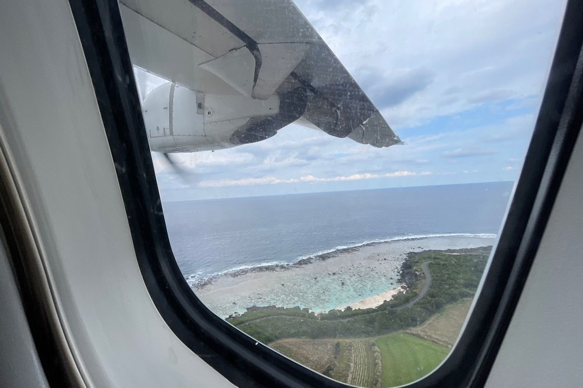 空港近くの海岸線をかすめるようにして大空へと上がる。通常であればここから高度を上げていくが、この便の目的地である徳之島空港は、飛行機からすれば目と鼻の先にある。飛行高度はおよそ400mと、東京スカイツリーの展望台よりも低い高さで飛行する。海が真下に広がり、風の影響で時折機体が揺れる。白波を立てる海面がすぐそこに見え、通常のフライトでは味わえないスリルがあった。