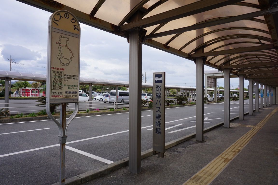 この島の中心地は、南東部に位置する亀津という町である。空港とは島の対極に位置しており、車でおよそ45分ほどかかる。島の規模が大きい分、バスの本数も多いことを期待したいところだが、実際には沖永良部島と大きくは変わらない。おおむね到着便に接続する形で運行されているが、基本的には鹿児島便に合わせたダイヤとなっており、奄美大島や沖永良部からの便に対する接続はない。そのため、ここでは1時間30分あまりの待ち時間が生じた。