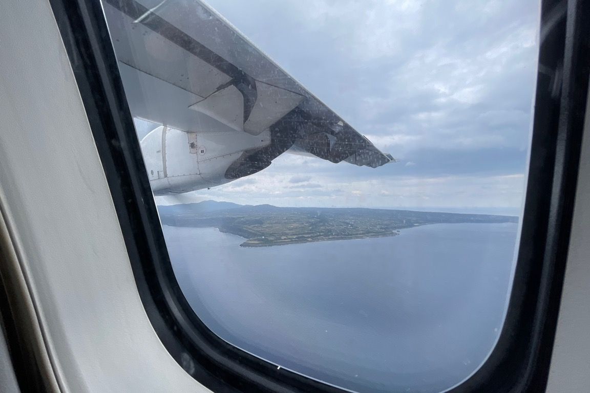 離陸から2分ほどで、「ポンポン」とサイン音が鳴り、客室乗務員から「当機は最終の着陸体勢に入りました」との案内があった。これまで様々な路線に搭乗してきたが、どんなに短くても飛行時間は45分程度はあり、巡航時間も5〜10分ほどは存在していた。しかしこの便には、いわゆる巡航と呼べる時間はなく、離陸直後に着陸態勢へと移行する。もちろんシートベルト着用のサインが消えることもなく、飴が配られることもない。鉄道でいえば、幹線から分岐する短い支線に乗り、発車した直後に「次は終点です」と案内される、あの感覚に近い。