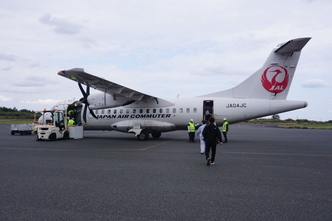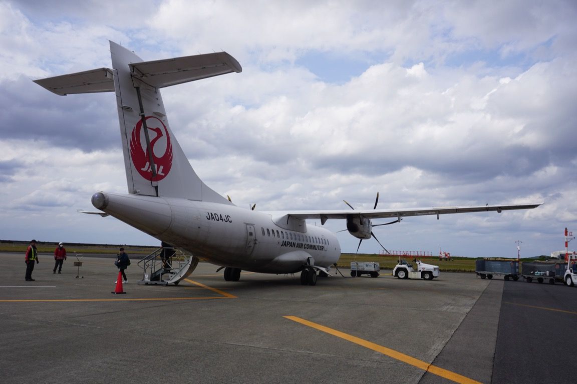 機体を降り、駐機場を歩いてターミナルへ向かう。定期航空協会加盟の航空会社が保有する機材の中では最小クラスとなるATR42-600。遠目には小さく可愛らしいが、間近で見ると意外なほど大きい。滑走路側を向いて降機するため、尾翼や機体後部を眺めながら歩くという、少し珍しい体験もできた。