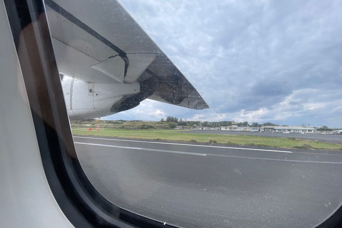 やがて海と陸地が目前に迫り、徳之島空港が近づく。機窓には平土野(へとの)と呼ばれる市街地が広がっていた。風の影響で機体がやや左右に揺れながらこの街の横を通過し、エメラルドグリーンの海岸線が視界に入った直後、搭乗機は徳之島空港へと着陸した。
