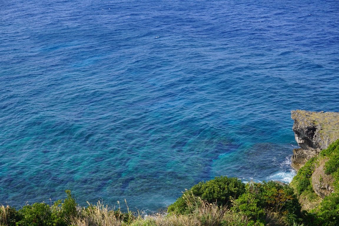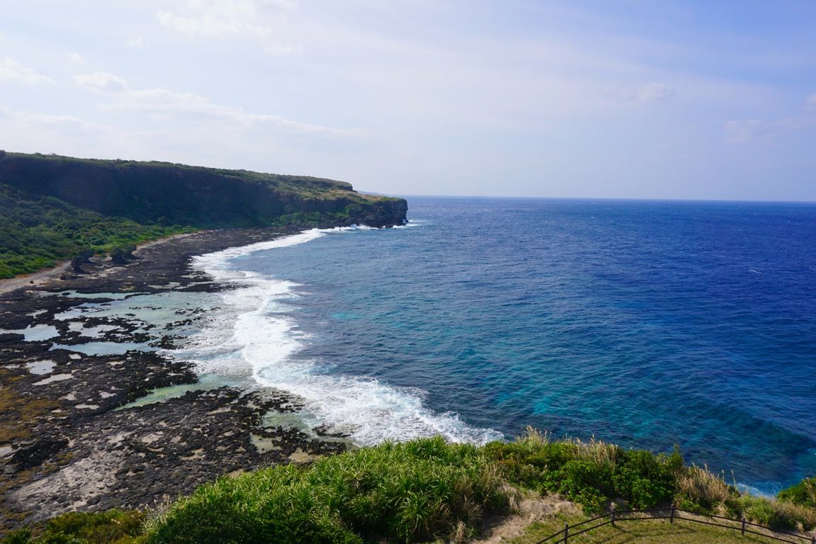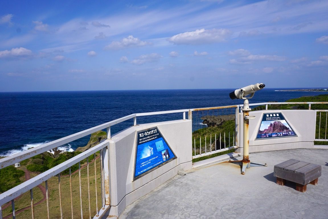 展望台へ上ると、その見晴らしのよさに圧倒された。切り立った崖の上に立つ展望台からは、徳之島の西側に広がる東シナ海を一望できる。青空が広がると、海もより一層青くなる。深いブルーの海は水平線まで続いている。