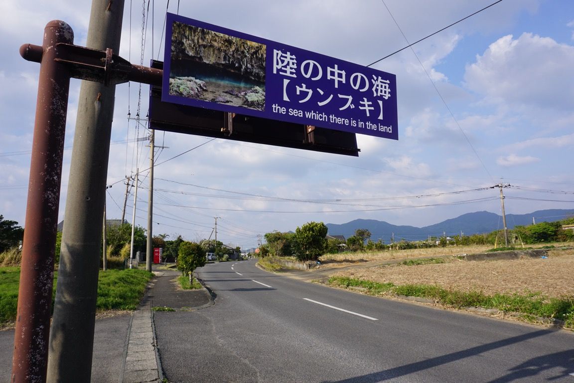 途中の道路沿いには「陸の中の海【ウンブキ】」と書かれた看板が立っていた。近くには下へと続く階段があり、沖永良部島で見た暗川にも似た光景が広がっている。陸の中に海があるとはどういうことだろうか。気になり、階段を下りてみることにした。
