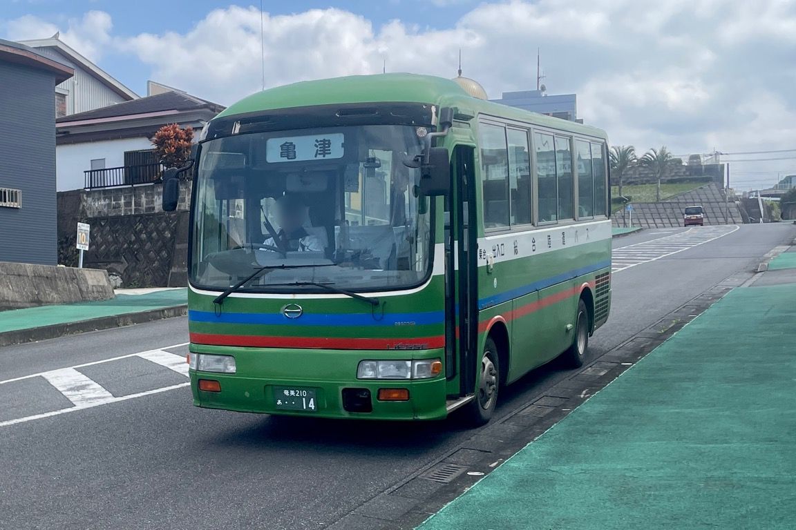 やがてバスの時間が近づいてきたので、道の駅前の道路上で待機する。しばらくして現れたバスに手を挙げて乗車の意思を示し、そのまま乗車した。今度はコンビニに立ち寄りつつ次の観光スポットへ向かうため、平土野のこの道の突き当たりで降ろしてもらうよう運転士に依頼する。すると運転士は「ファミリーマートに行くの?」と一言。さすがは運転士さんで、降車場所から行き先をすぐに察していた。
