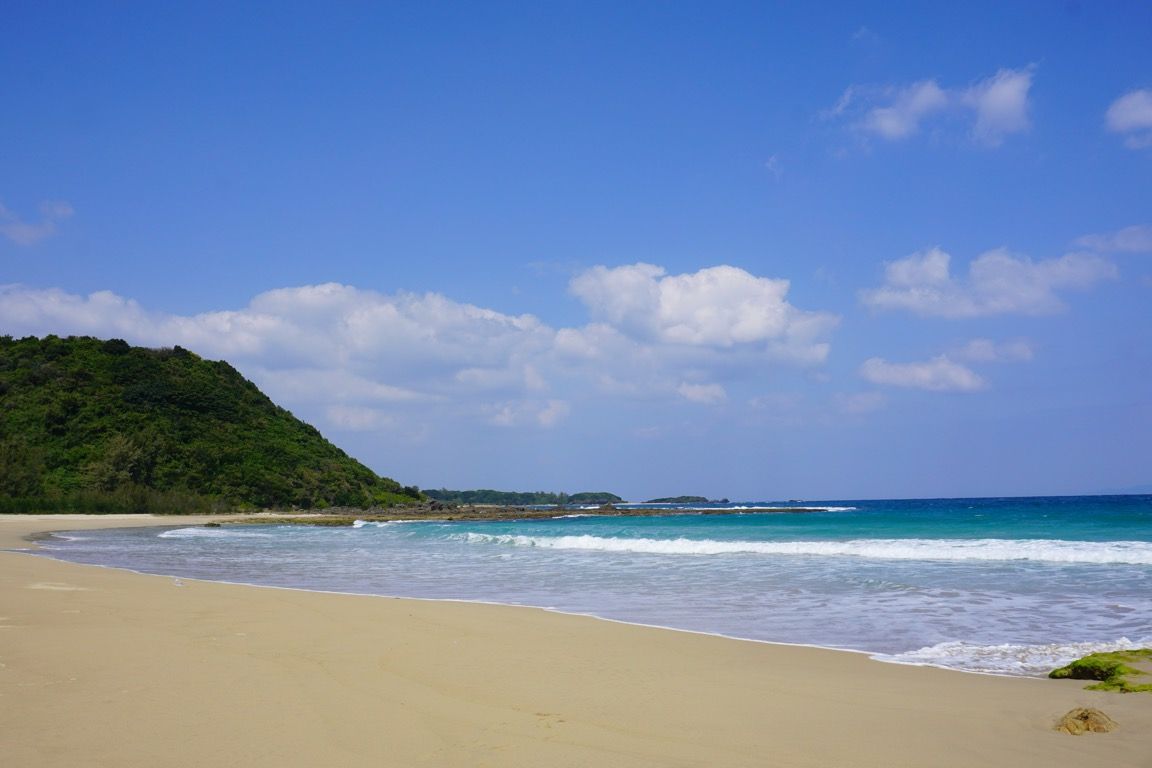 誰もいない砂浜にポツンと身を置き、目の前に広がる大海原を眺める。砂浜に足跡をつけるのが申し訳ないほど、白い砂は波によってきれいに整えられていた。花徳浜の南側には、すり鉢のような形をした小高い山がある。この山の向こう側にもビーチが広がっているということで、次は歩いてそちらへ向かった。