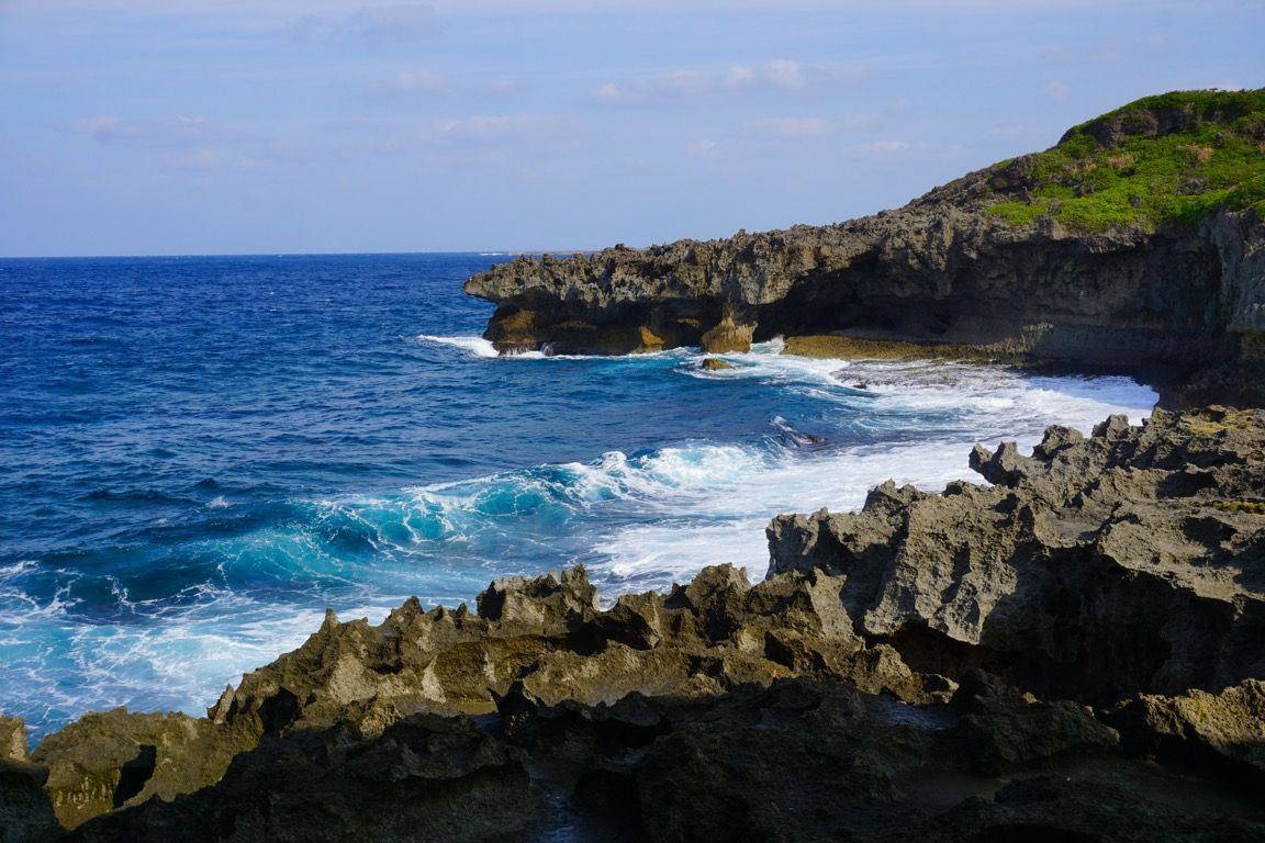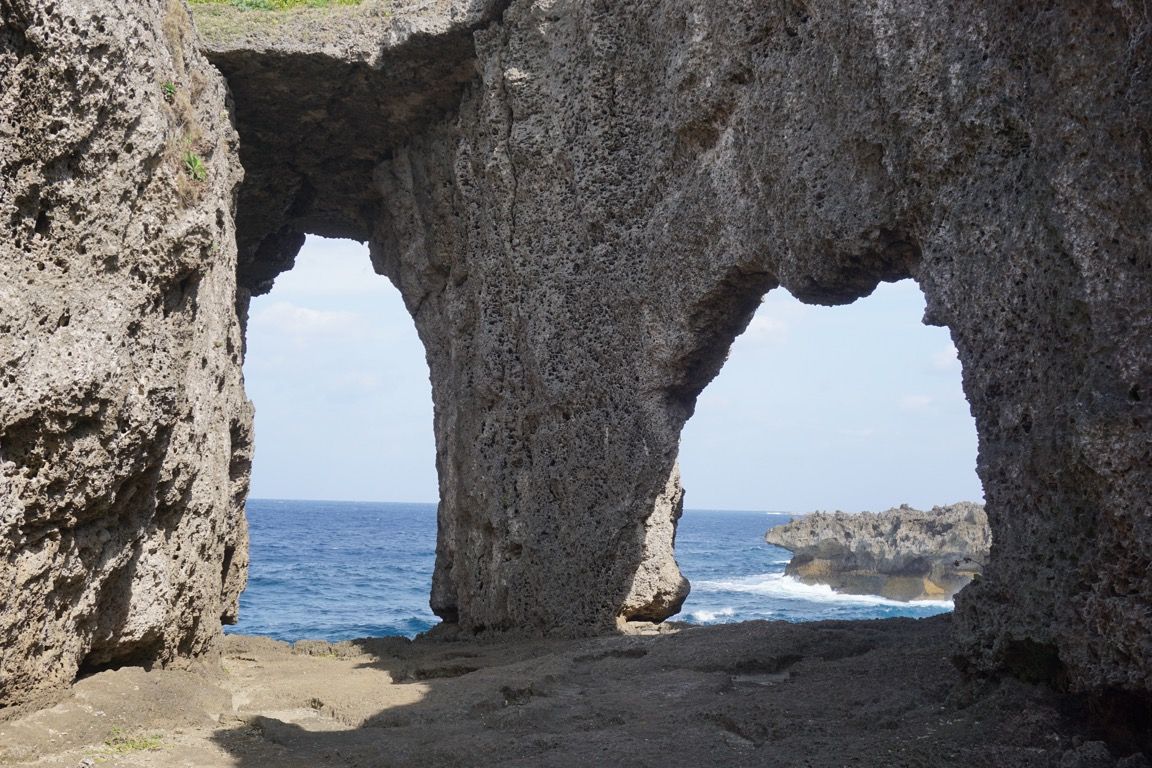 今度はメガネ岩をくぐり抜けた先から海岸を眺めてみる。沖永良部島の田皆岬やフーチャと同様に、ここにも柵などは設置されていない。鋭く尖った岩に足を取られないように、そして何より転落しないように、細心の注意が必要である。