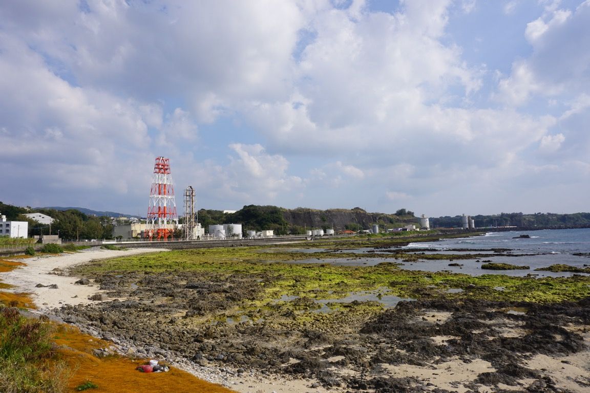 施設を後にし、消防署の前を通過して海の方へ向かう細い道を進む。九州電力の新徳之島発電所の裏手を回り込むように歩き、やがて海岸沿いへと出た。あとはこの道をひたすら歩いていけば空港へたどり着く。発電所の煙突や燃料タンクが並び、どこか臨海部の雰囲気が漂う平土野の海沿い。その奥に見える崖の上を、午前中には犬の門蓋から歩いてきた。