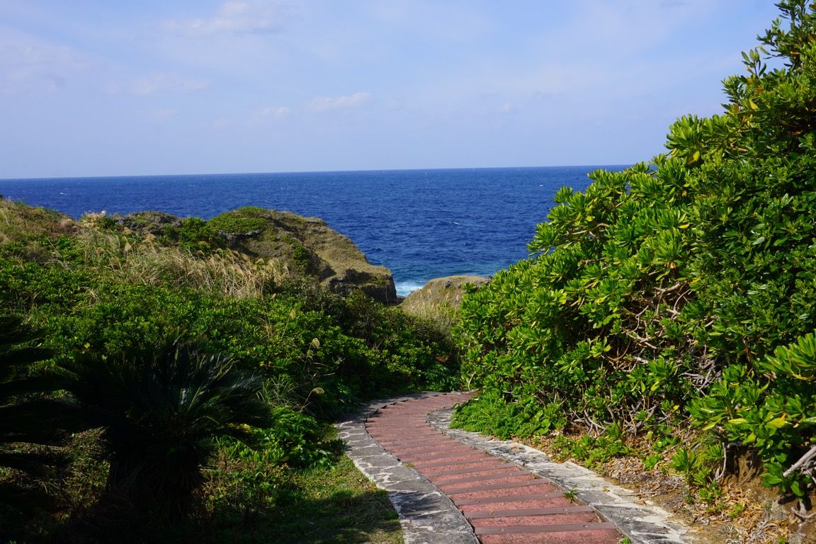 さて、展望台からの景色を楽しんだ後は海岸線へと降りていく。展望台の脇から続く階段を一歩一歩進んでいくと、やがて海岸に出る。途中から望む海の景色もまた美しい。同時に、両側に生える植物も南国らしさを演出していた。海岸へと近づくにつれて、遠くで聞こえていたサトウキビ畑の刈り取り音は消え、次第に海の音が耳を支配していく。