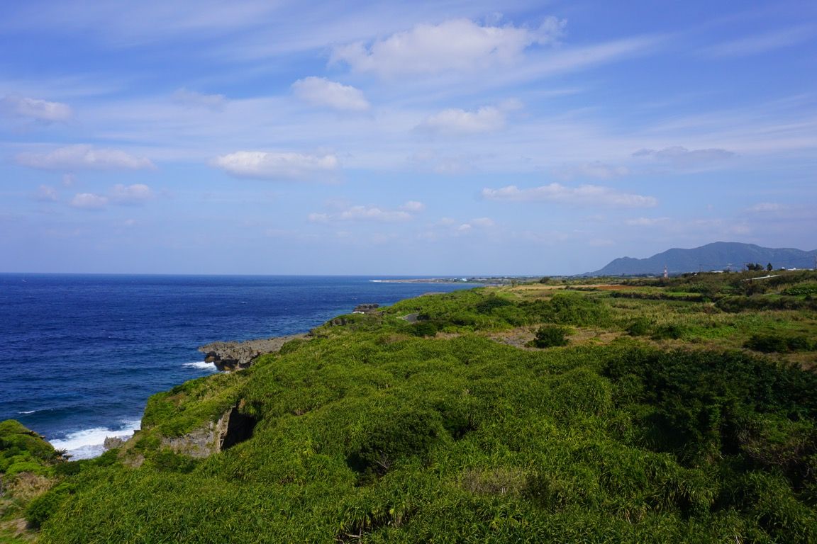 こちらは島の北側を眺めている。奥に見える山は、前々話の空港線のバスの乗車記でも紹介した、通称「寝姿山」と呼ばれる山である。左側を頭にして妊婦が横たわっているように見えることから、子宝の島の象徴ともいわれている。徳之島は島の北側と中央から南側の2か所に連山が聳えており、この寝姿山は、北側の天城岳を中心とした連山を南側から見たときに姿を現す。空港線のバスが走る県道は、この2つの連山の間を抜けて東海岸へと向かっている。