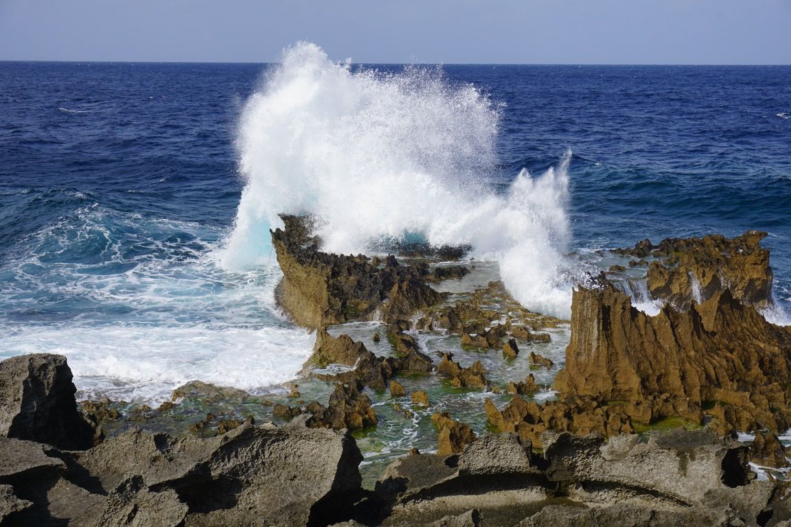 メガネ岩のある狭い崖の隙間の横へ進むと、荒々しい奇岩が連なる海岸を望むことができる。海へと突き出た岩場に波が当たると、背丈を超えるほどの水しぶきが上がり、それが風に乗ってこちらまで届く。時には見ている場所のすぐそばまで波が押し寄せることもあった。その「ゴーッ、ドン」という音は、砂浜とは異なる荒々しさを持ち、恐怖心すら感じさせる。しかし、その光景はなぜか見飽きることがない。単調でありながらも複雑な、岩と波のせめぎ合いに、地球の営みを感じずにはいられない。