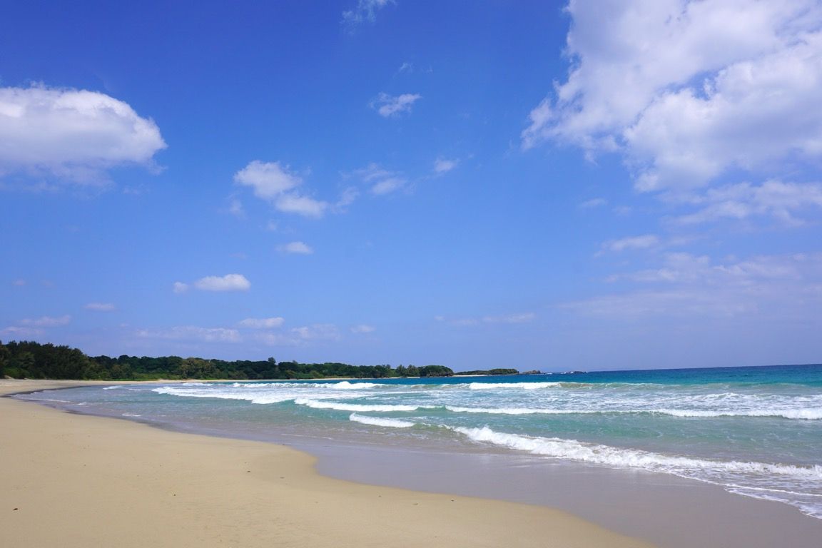 こちらも観光客は筆者ひとりだけ。誰もいない砂浜から青い海を見つめる。遠くには請島・与路島・加計呂麻島あたりの山影が見える。空には青空が広がり、清々しい光景が広がっていた。ここでもしばらく海岸の眺めを楽しみ、徳之島の海の青さを味わった。