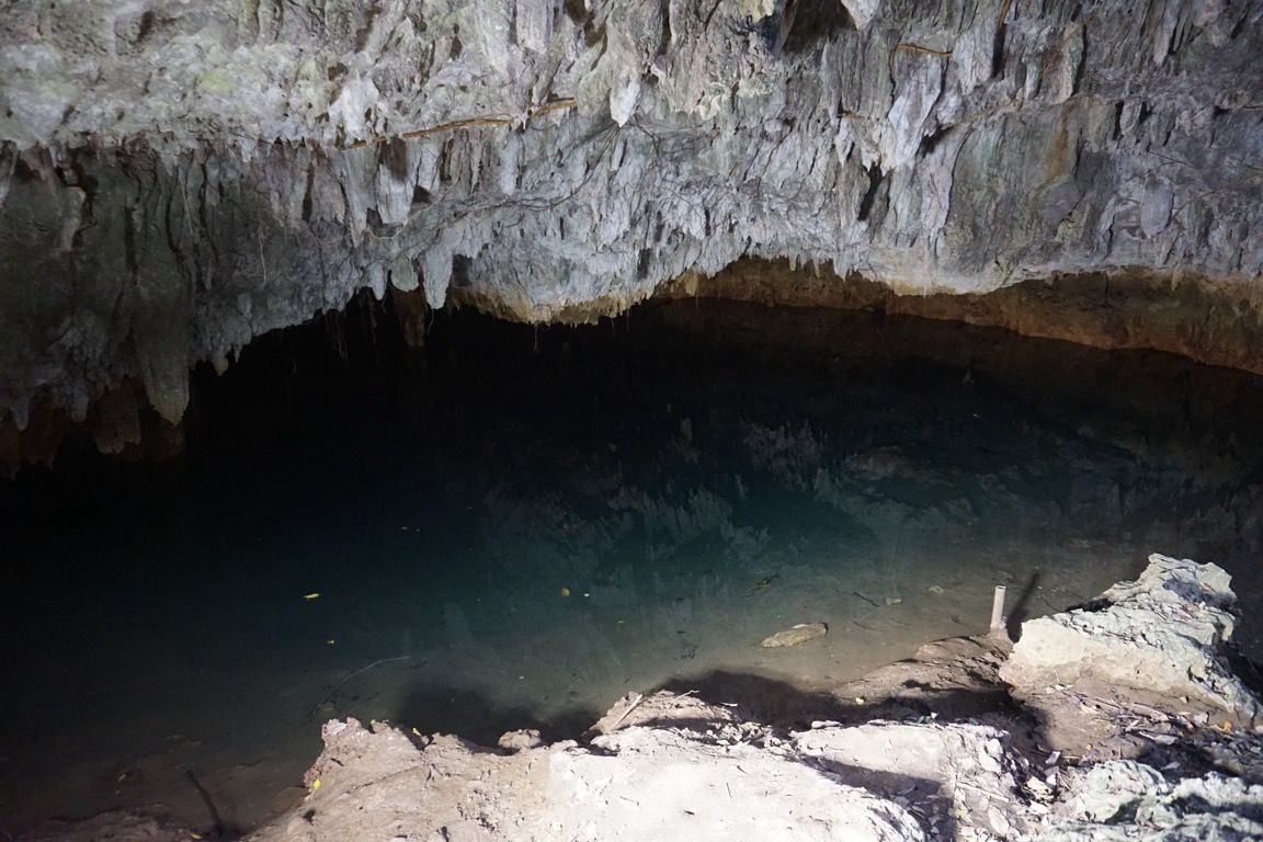 「陸の中の海」とあるように、ここは海水に満たされた鍾乳洞である。見えているのはその一部に過ぎないが、内部は広範囲に広がっているという。鍾乳洞内は海水と地下水で満たされており、潮の満ち引きによって水位が変化する。どこかで海とつながっていると考えられているが、その出入口は現在も確認されていない。この鍾乳洞はかつて陸上にあったものが、海面上昇によって水没し、現在の姿になったとされる。内部からは縄文土器も発見されており、かつては生活の場として利用されていた可能性もある。空港のすぐ近くに、これほど神秘的な空間が広がっていることに驚かされた。