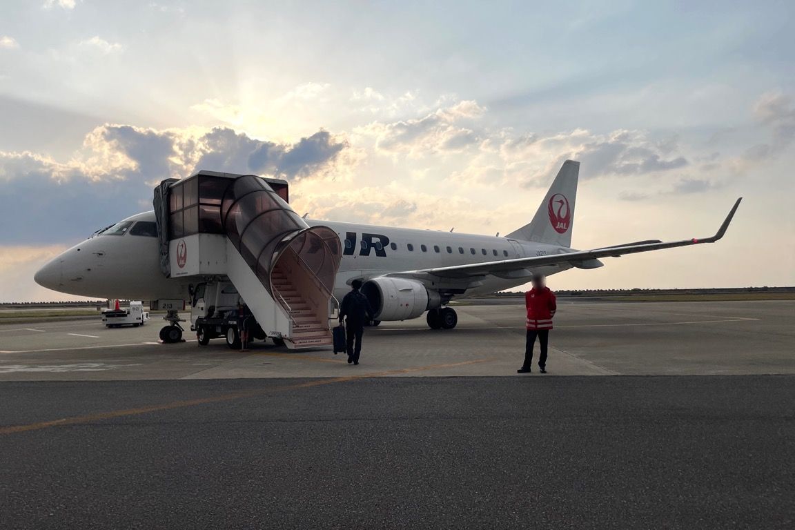 鹿児島発着の離島路線でJ-AIRが就航しているのは、奄美と徳之島の2路線。いずれも一部便のみJ-AIRが担当し、その他はJACが運航している。ジェット機とターボプロップ機では飛行性能が異なるため、両者で所要時間もおよそ15分程度異なる。J-AIR担当便は通常、Embraer E170で運航されるが、機材繰りの関係でE190が使用されることもある。旅行日前後はJAC側で整備に伴う機材不足が発生していたため、通常JACが運航する一部便もJ-AIRに変更されていた。筆者が搭乗した一便前の鹿児島行きも、その影響でE190が使用されていたようだ。