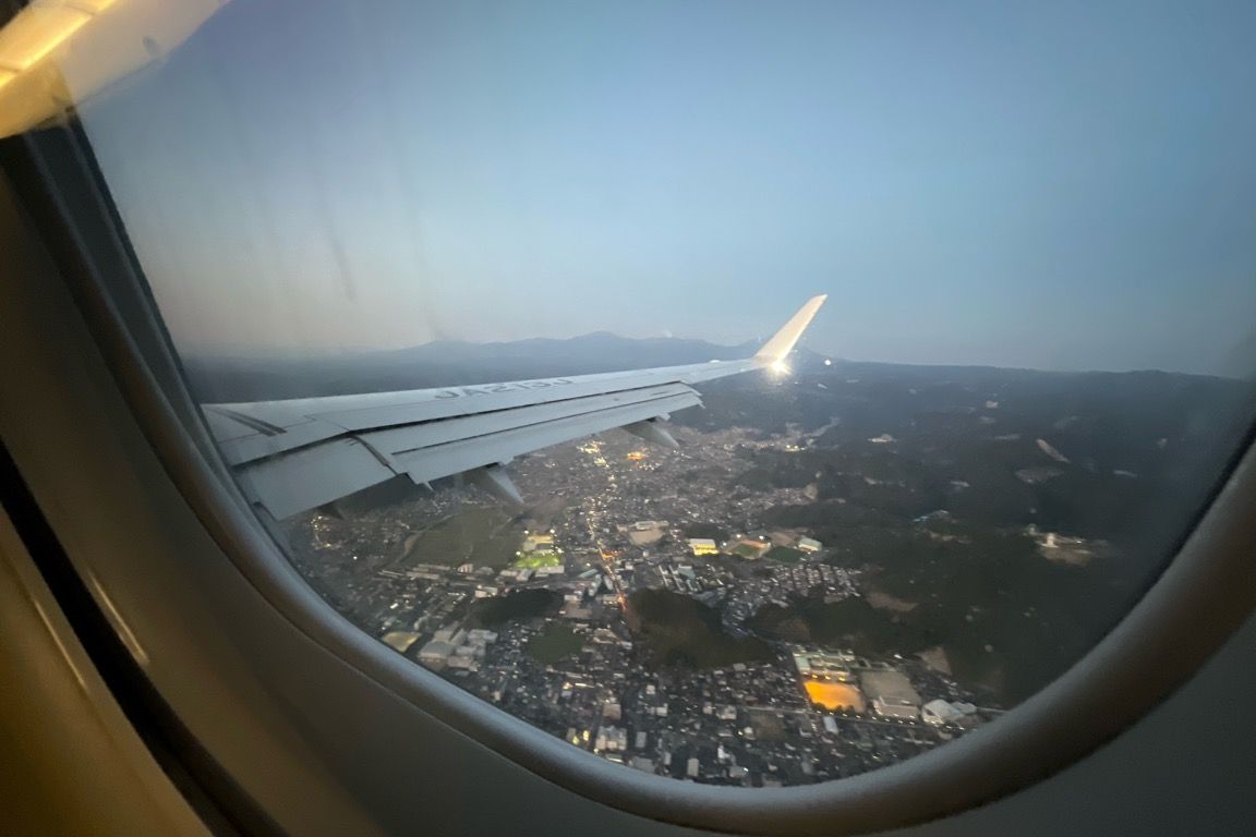 しばらく大隅半島を眺めながら、あそこが根占、大根占だろうかと辿っていると、真下に街が広がった。搭乗機は薩摩半島上空へと差しかかり、眼下には指宿市街地や山川港が見える。街には街灯が灯り始め、車のライトが行き交う様子も確認できた。夕暮れとともに、鹿児島空港が近づいてくる。