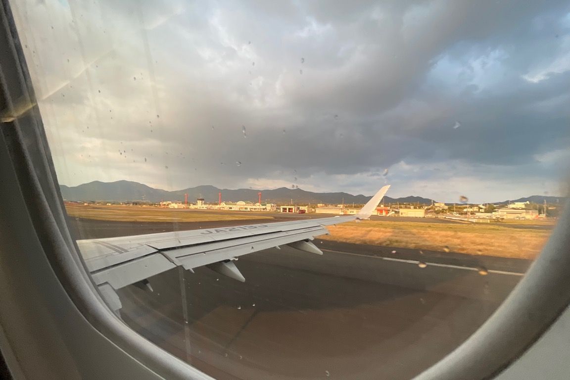 ゆっくりと滑走路へ向かい、転回して待機する。指定時刻を待つ間、雨がぱらぱらと窓を濡らす。一方で、空港背後の山は夕日を受けてオレンジ色に染まっていた。その光景は、旅を終える寂しさと明日への活力が同居しているかのようにも思えた。やがて指定時刻となり、機体は滑走路へ進入。ターミナルを横目に、一気に加速して空へと舞い上がった。