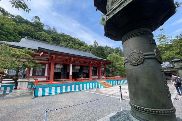 本殿の下まで到着。ケーブルカーの駅からここまでは、ほとんど勾配なく来ることができるが、ここから先は階段をかなり登っていく必要がある。沿道に植えられているのはもみじの木。紅葉の時期はきれいに色づききれいなんだそう。この日は若葉の新緑がとても美しかった。蒸し暑いながらも真夏の暑さではなかったのが幸い。それでも息を切らしながら、階段を上って本殿へと向かった。