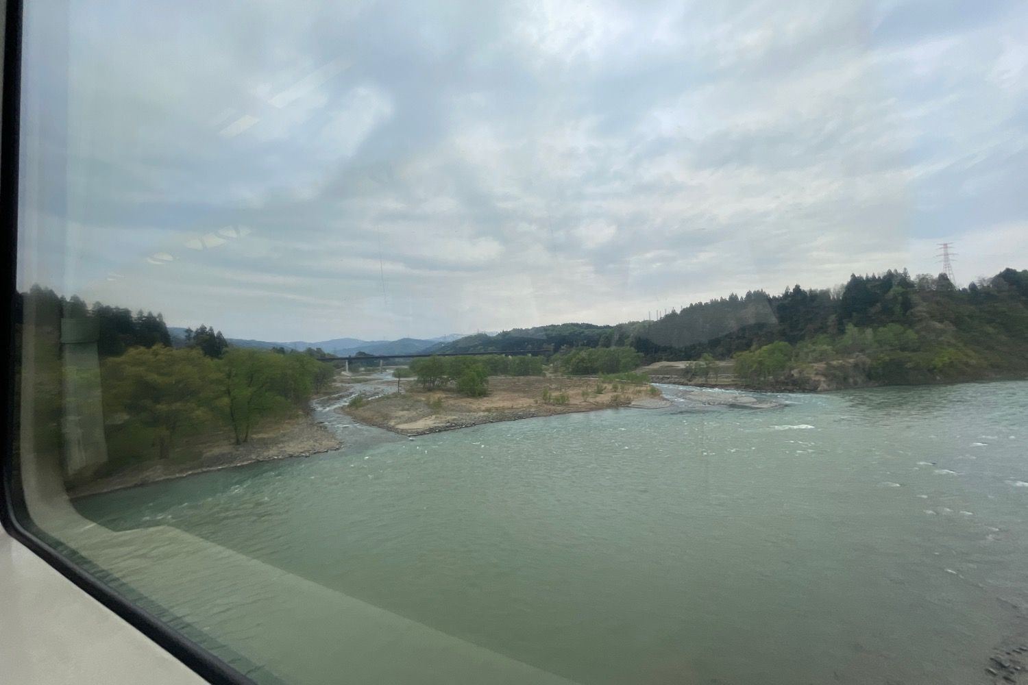 最初の停車駅、北長野駅では早速、車内の乗客の3割程度が下車。次の三才駅は名前が特徴的で三才になったら子どもを連れていく駅としてもはや観光地化している。隣のボックスシートに座った親子連れも、三才駅に訪れることが目的だったようで、この駅で列車を下車していった。広い善光寺平を走る列車。車窓の奥は長野電鉄が走る須坂あたり。その奥に聳えるのは、長野県と群馬県を隔てる山々である。やがて車窓には新幹線の車両基地が見える。長野新幹線車両センターは、2019年にこの地を襲った豪雨で多数の新幹線車両が浸水し、その後しばらくの間北陸・上越新幹線の運行に影響が出た。鉄橋を渡ると、豪雨の対策工事だろうか、川の護岸工事を行っているのが見えた。