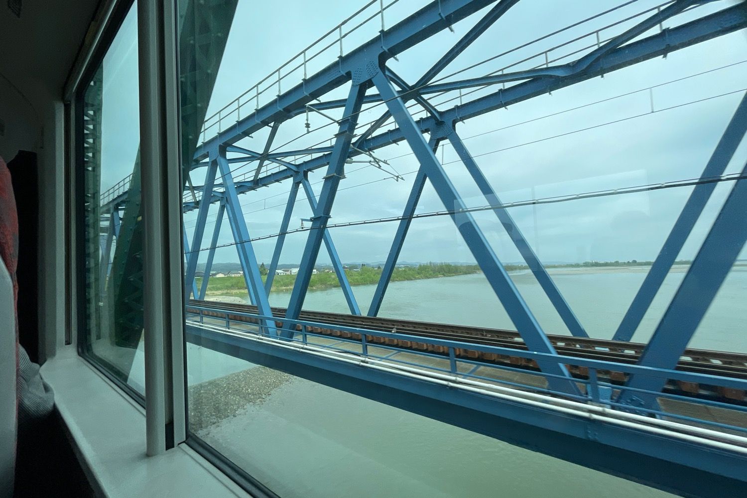 長岡駅を出ると、長岡貨物ターミナルの横を通過。このあたりで上りの特急しらゆき1号とすれ違った。すれ違った列車は数日前に運行を開始した上沼垂色と呼ばれる復刻塗装を纏った車両だった。直後に通過する宮内駅は上越線が分岐する駅。新前橋から上越国境のトンネルを抜けて走ってくる上越線は、長岡ではなく宮内が終点となる。後から乗車する上越線の線路が離れていくと、列車はその先で信濃川を渡った。1日目に飯山線で並走した信濃川。飯山線、上越線に沿って流れた川はこの辺りで越後平野へ流れ出る。