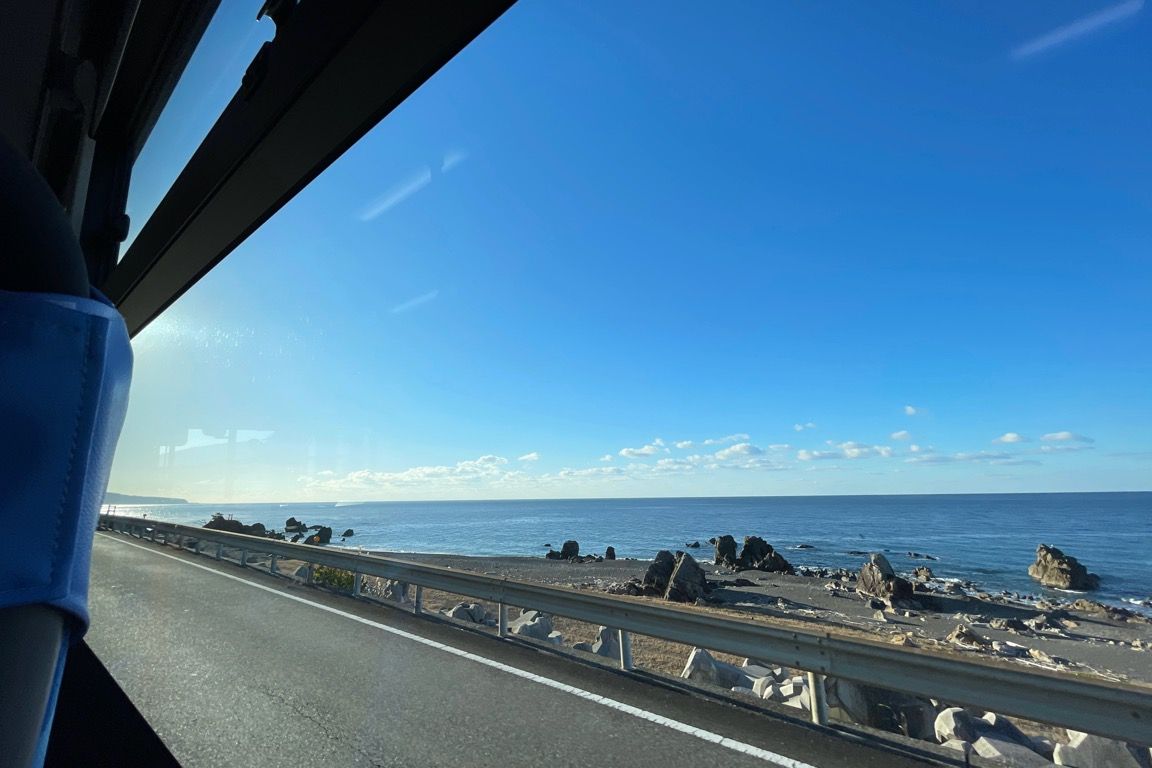 バスは安芸から室戸まで、ほぼひたすらに太平洋の大海原を見ながら走っていく。この日は快晴で、とても穏やかな景色が広がっていた。過去の天気の傾向から、冬の室戸周辺は晴れている日が多いようだったので、この季節を選んで来てみたが、この季節に来て正解だった。夏はまた夏で、積乱雲が出ていて夏らしい景色が楽しめるはず。また来ることがあれば季節を変えて楽しんでみたいなと思う。