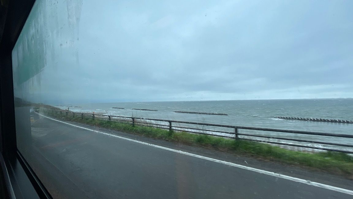 松ヶ崎を出てしばらくすると、車窓の目前には日本海が広がった。ここまでも海はチラチラ見えていたが、家や林が広がっていて、なかなか見辛かった。しかし、ここから本荘の市街地の手前までは、海を目の前に走っていく。天気が良ければ、風光明媚な車窓だろうが、この日はどんよりした空と海が広がっていた。反対側は断崖絶壁の崖になっている。昨年乗車した北海道の「ましけ号」が走る雄冬ほどではないが、荒々しい地形が続いている。