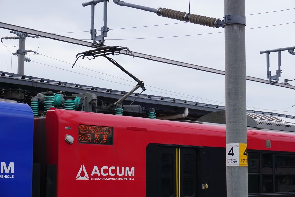 先述の通り、このEV-E801系は交流形の蓄電池車である。男鹿線は全線が非電化の路線だが、路線全長が26kmと比較的短く、全列車が交流電化された奥羽本線へ乗り入れるため、蓄電池車との相性が良かった。そこで、2017年にEV-E801系がまず1編成だけ先行的に投入され、その後2021年に増備された編成が、それまで活躍していたキハ40系を完全に置き換えた。この車両の運行開始に当たっては、終点の男鹿駅に充電設備が設けられた。奥羽本線走行時と男鹿駅停車中にはパンタグラフから電気の供給を受け、走行・充電を行う。一方、非電化区間では充電した電気を用いて走行するしくみである。東北地方でこの運行方式を採用しているのは男鹿線のみ。全国的にも栃木県の烏山線と、福岡県の香椎線、筑豊本線(若松線)と男鹿線の4路線しかない。このうち烏山線のみが直流の蓄電池車であり、こちらではJR東日本などが開発した直流形のEV-E301系が活躍している。JR東日本の蓄電池車2形式(EV-E301系、EV-E801系)には共通して「ACCUM」の愛称がついている。