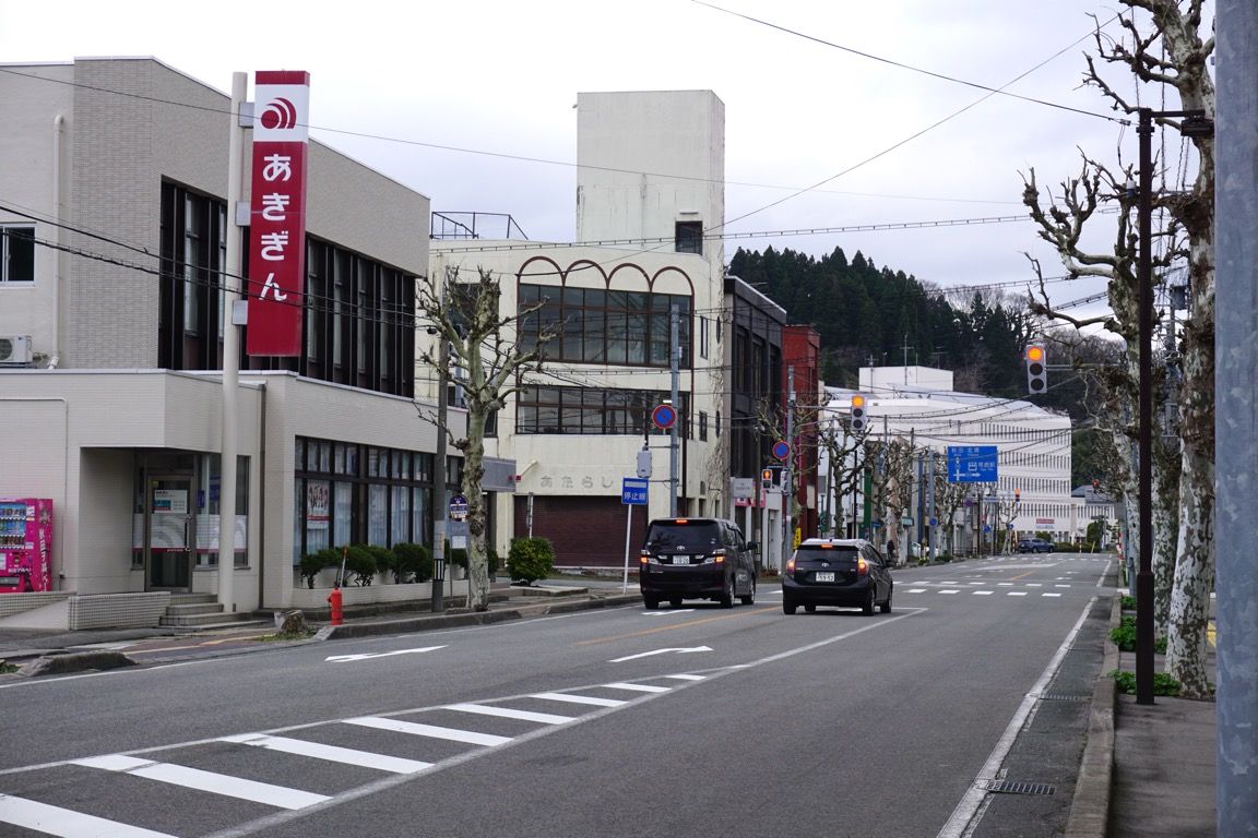駅横の通りから一本進んだ通りが男鹿市のメインストリートである。奥の方には男鹿市の市役所が見えた。男鹿市の人口は2万3千人ほど。秋田市街地から1時間ほどの場所ではあるものの、近年は過疎化が進行している。調べると2012年には3万2千人だったようなので、10年強で1万人弱も人口減少していることになる。秋田県は全国で最も人口減少率が高い県だが、男鹿市はその中でも特に減少率が高い。
