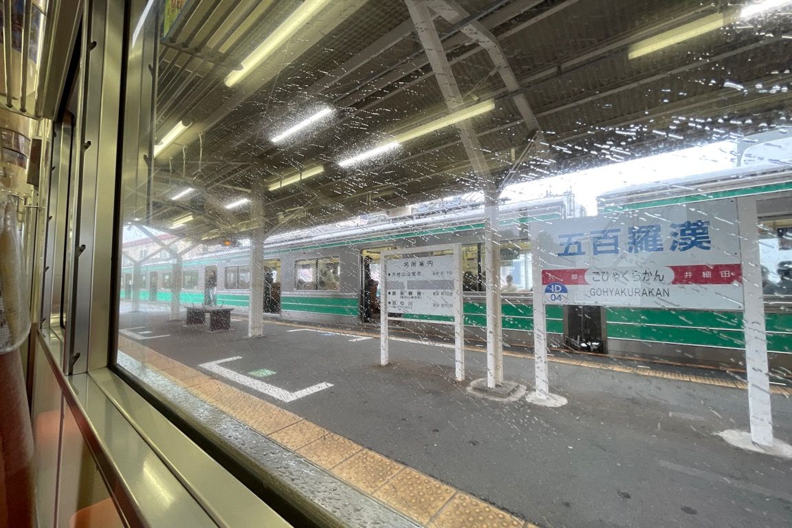 小田急足柄駅の北側に位置する五百羅漢では対向の列車と交換。大雄山線は単線だが、日中も15分間隔で運転されているので、数駅ごとに反対列車とすれ違う。やはり上り列車には多くの乗客の姿があった。五百羅漢を出たところで大雄山線は小田急小田原線の下を潜り、同線と東西の位置が入れ替わる。