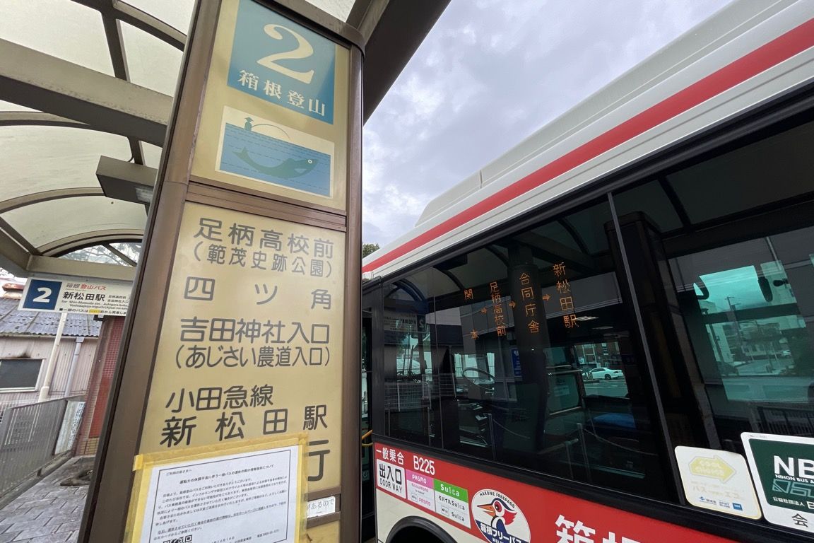 関本では5人ほどが乗車。バスは駅前を走る県道74号線に沿って市街地を進み、切通しという名の交差点を右折した。その後、開成町の街中を横断する。開成町には小田急の開成駅があるが、役場などはこのバス路線沿いに位置している。やがて開成町を抜けると、バスは酒匂川を渡り、一旦御殿場線を跨ぐ。JR松田駅入口を経由した後、松田連絡線と御殿場線の線路下を潜り抜けて、終点の新松田駅に到着した。