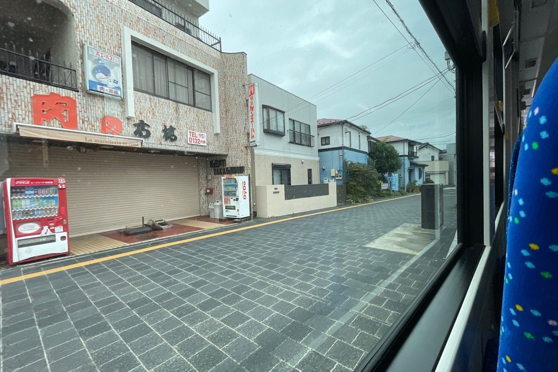バスは5人ほどの乗客を乗せて発車。この便は途中の乗車がないため、これで最終的な乗車人数が確定ということになる。ロータリーを周回したバスは、下り坂を滑るように山を降りていく。普通便と同じ経路かと思えばそうではなく、大山駅バス停近くでも県道には入らず、そのままバイパスを直進。車窓の左側には、普通便が走る狭い県道と住宅が続く風景が見えた。対向車に気を配る必要がないため、バスは軽快に進んでいく。車内では、地元出身の噺家による大山観光案内の放送が流れ、観光地らしさを感じることができた。