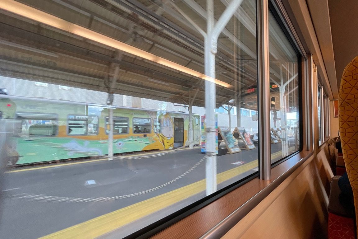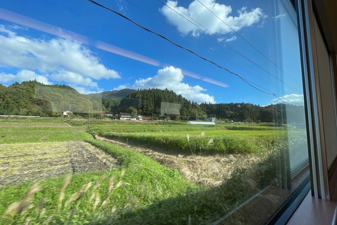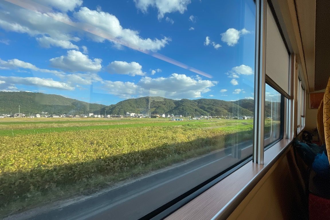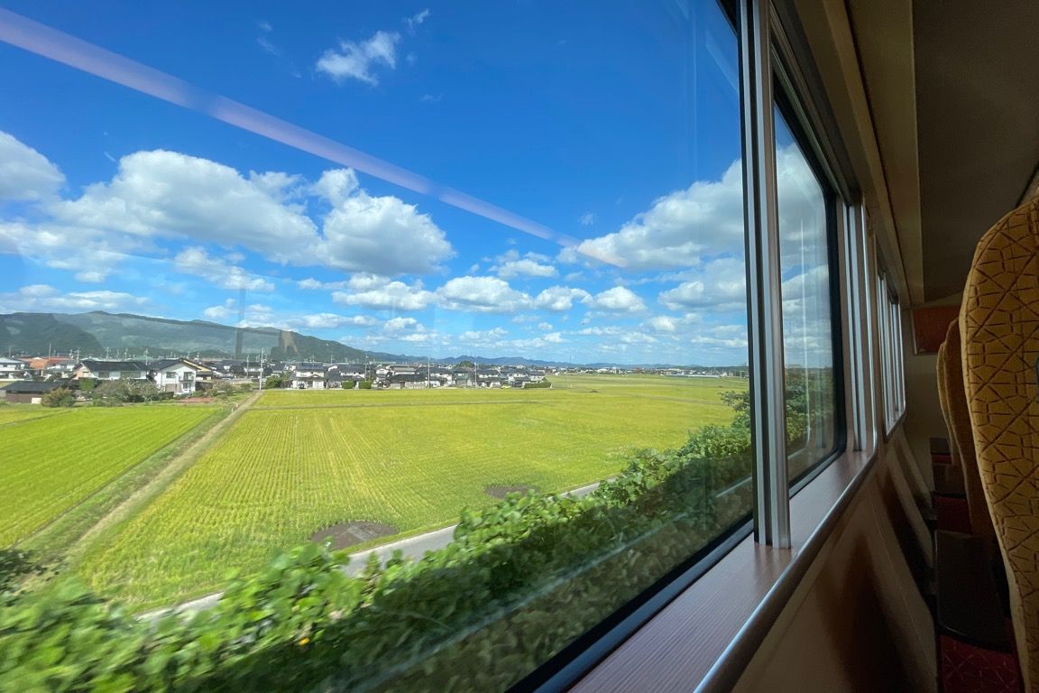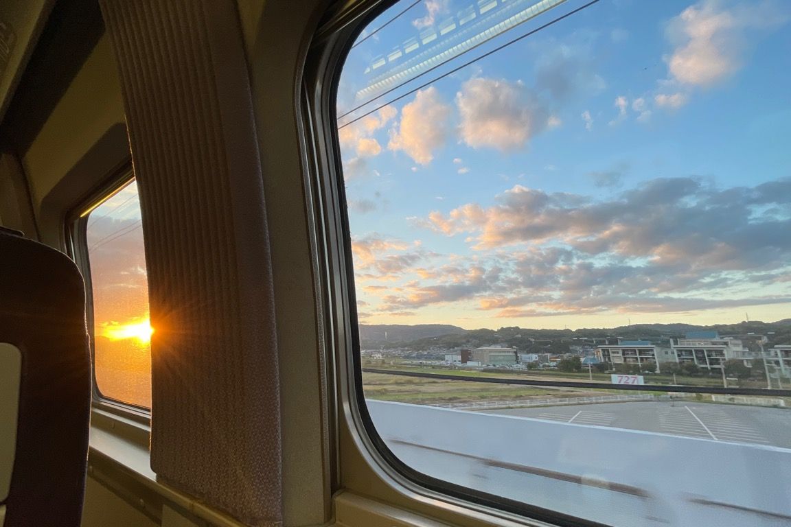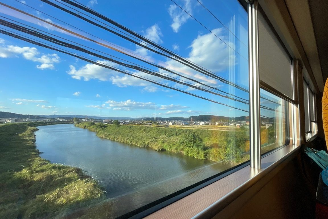 夕刻の景色は、静かに旅の終わりが近づいていることを告げ、心は少しそれに抗おうとする。これから新幹線に乗り換えるとはいえ、日常が一歩ずつ近づいてくる感覚は否応なく訪れる。日常が嫌いなわけでは決してない。むしろ旅に出る前には、「なぜこんな旅程を組んだのだろう」「ずっと日常にいたい」とすら思うこともある。それでも、旅の終わりが近づくと、また旅を続けていたいと思ってしまう。この列車の軽やかな走りと同じように、心もまた、旅によって軽くなっていた。