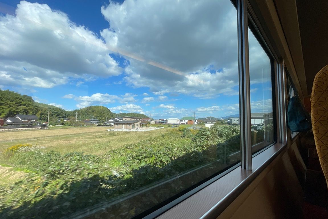 生山を出ると、列車は引き続きのどかな田園風景の中を走っていく。振り子式を採用するこの車両は、伯備線内では他の列車よりも高い速度で走行できるため、先ほど乗車していたサンライズ出雲よりも、流れる景色が明らかに速く感じられる。