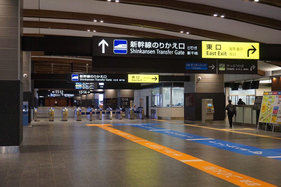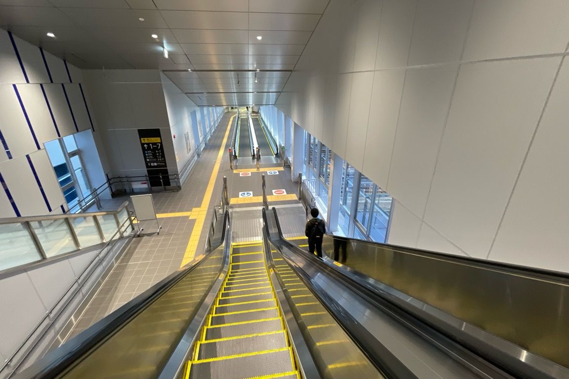 従来からあるホームの上を通過すると、動く歩道とエスカレーターを乗り継ぎ、新幹線駅舎の2階へ。通路の雰囲気は、駅というより空港の降機後に歩く通路にも似ている。共用開始からまだ1年半ほどの新幹線駅舎は、随所に新しさを感じさせる。