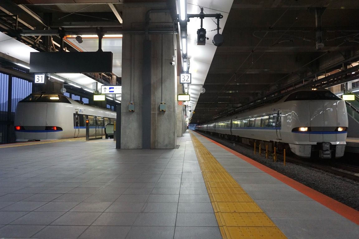31・32番のりばは到着列車用、33番のりばは特急「サンダーバード」、34番のりばは特急「しらさぎ」と、列車種別ごとにホームが使い分けられている。停車位置にも違いがあり、「サンダーバード」は後寄り、「しらさぎ」は前寄りに停車する。動線の重複を防ぐと同時に、外観がよく似た車両による乗り間違いを防止する意図もあるのだろう。