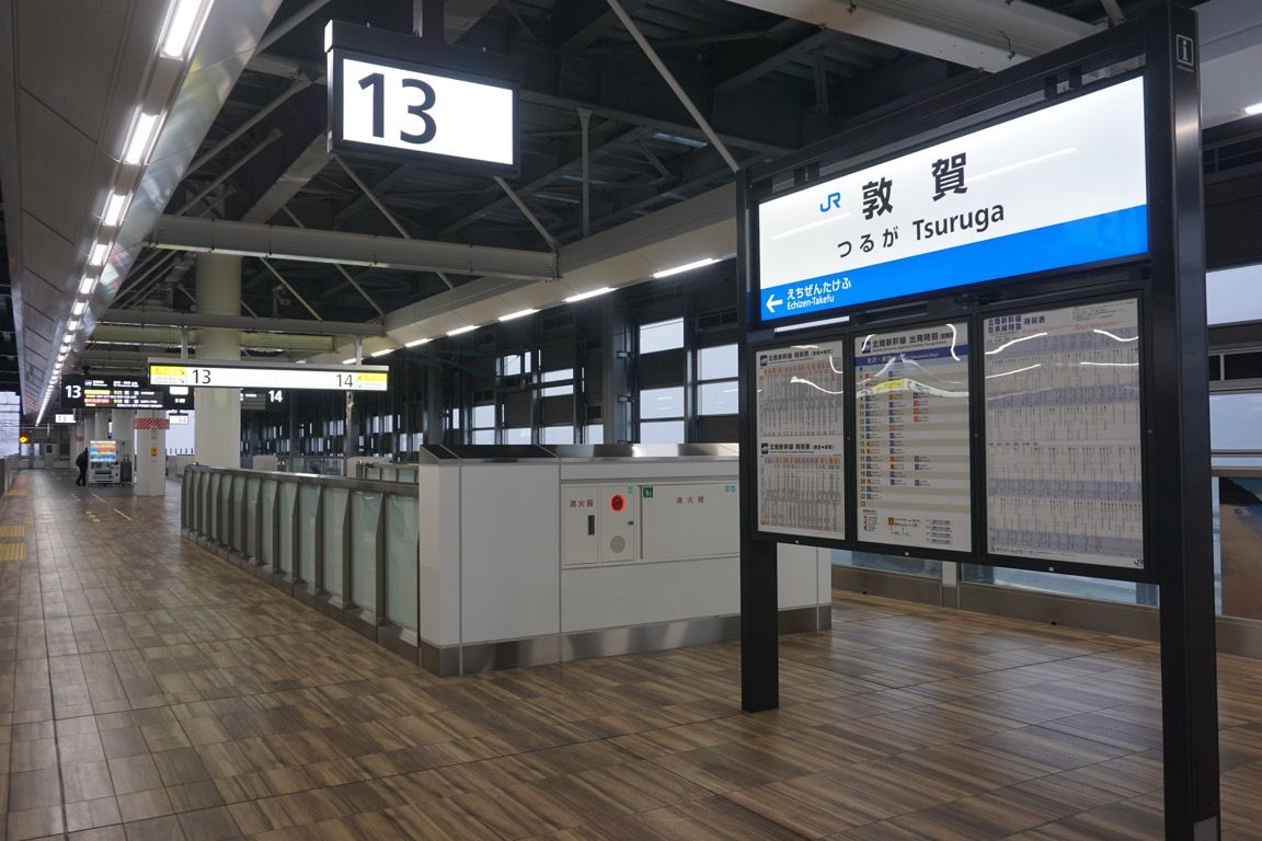 広いコンコースを歩き、新幹線のりばへ向かう。多くの乗客にとって敦賀駅は乗り換え地点であり、列車の到着・発車時間帯を外れると、構内は驚くほど静かになる。新幹線ホームの床はフローリング調で、在来線特急ホームと同様に2面4線の構成をとる。11番線のみは行き止まりとなっており、車両基地への回送線とは接続されていない。