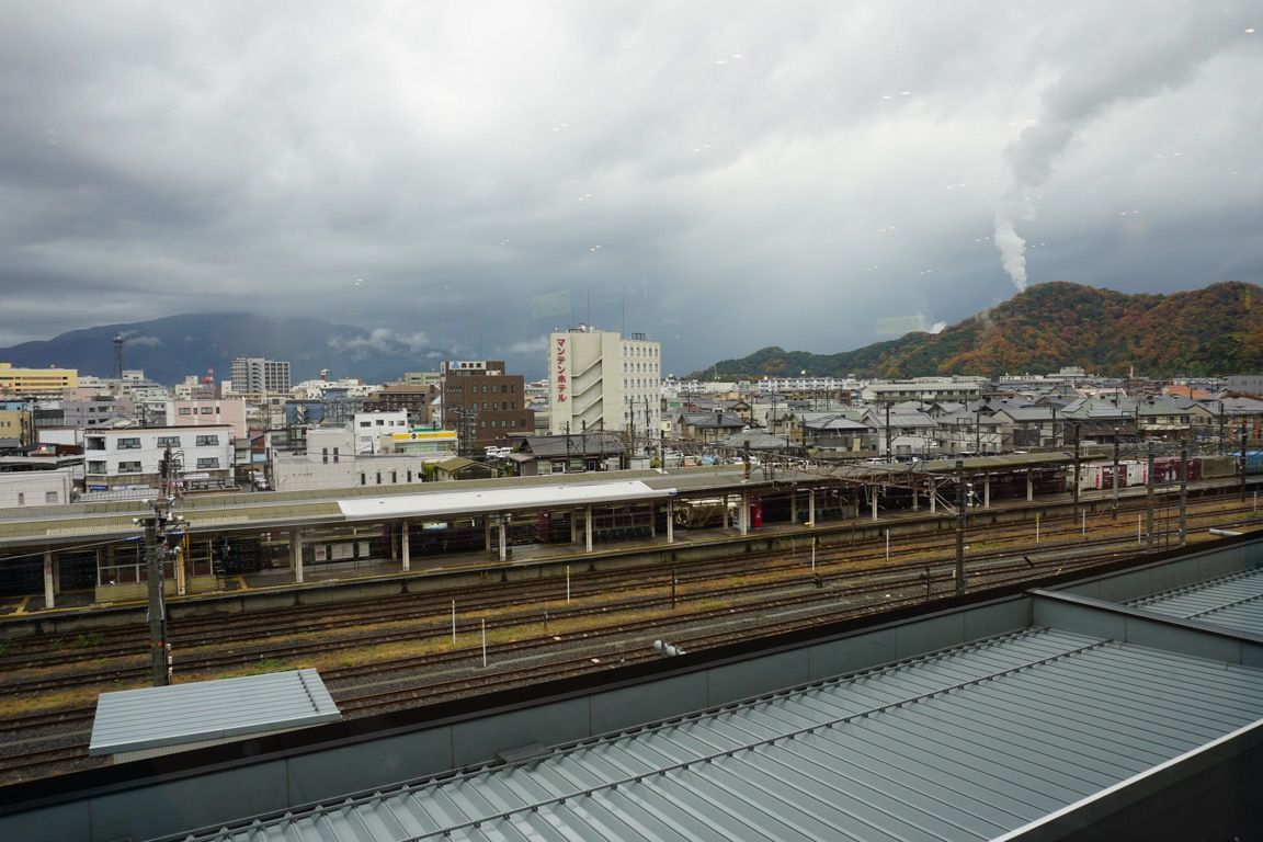 新幹線ホームはかなり高い位置にある。この駅では3階相当だが、周囲の建物と比べると、雑居ビルの5〜6階ほどの高さに感じられる。窓越しに見下ろす周辺の景色は、まるで展望台からの眺めのようだった。
