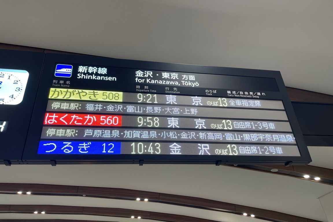 乗り換え改札の先に設置された発車標を眺める。黄色の「かがやき」、赤の「はくたか」、青の「つるぎ」と、北陸新幹線の3列車が色分けされ、整然と並んで表示されている。この色分けは、東海道・山陽新幹線の「のぞみ」「ひかり」「こだま」を思わせる。ただし「つるぎ」は必ずしも各駅停車ではない。写真は13・14番のりばから発着する列車を示したもので、9時台にも富山行きの「つるぎ」が2本設定されている。筆者がこれから乗車する「かがやき508号」は、この時間帯では2本目の新幹線となっていた。