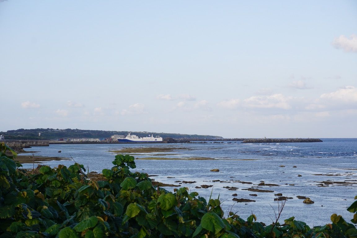 ふと視線を移すと、和泊港に停泊していた貨物船がゆっくりと動き出した。港内で大きく船体を回転させ、やがて加速すると、静かに沖合へと去っていく。その姿を見送り、筆者も再び歩き出した。