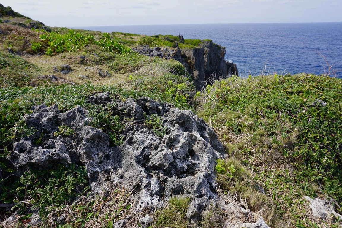 足元の岩に目を向けると、そこには石灰化したサンゴの痕跡がはっきりと残っている。つまり、いま立っているこの場所も、かつては海の底だったということ。長い時間をかけて積み重なったサンゴ礁が地層となり、それが隆起してこの島を形づくった。そして今もなお、目の前の海がその地形を少しずつ削り続けている。この風景もまた、長い地球の歴史の中の、ほんの一瞬に過ぎない。