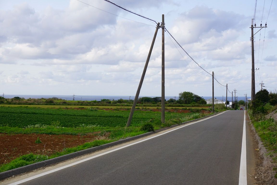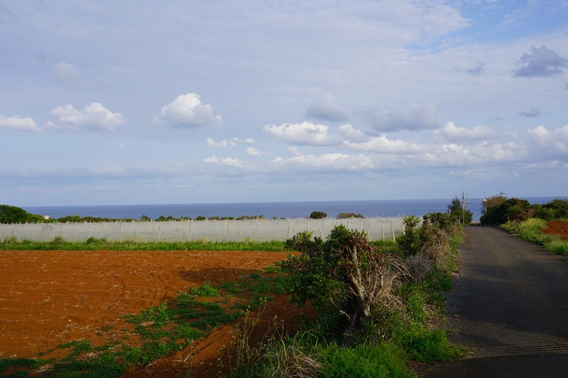 牛舎の並びを抜け、さらに高い場所へと出る。振り返ると、先ほどまで間近にあった海が、今は遠くに広がっている。周囲にはサトウキビ畑やジャガイモ畑がどこまでも続く。そんなのどかな風景の中を、淡々と歩いていった。