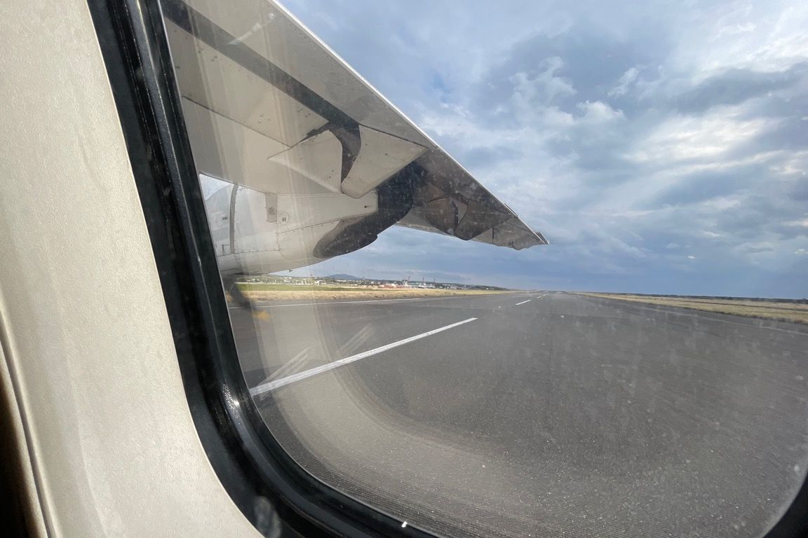 ドアが閉まるとすぐに客室乗務員による案内と安全についての説明が行われる。その間にエンジンが始動し、プロペラが回り始めると、まもなく地上係員の見送りを受けて、搭乗機は駐機場でターンし、滑走路へと進んだ。