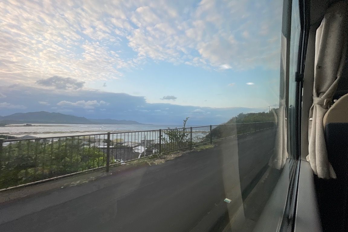 花徳を通りすぎて、バスは母間地区を通過する。アップダウンとカーブが連続する県道からは、島の北側の海岸線を望むことができる。小さな岬を回ると、車窓には走ってきた海岸沿いの集落と、その先へと続く海岸線が広がる。夕日を浴びた雲はオレンジ色に染まり、海面もまたそれを映して輝いていた。そうした景色を眺めながら、バスはしばらく海岸沿いを走っていく。ここまで乗車する人はいなかったが、下志久という集落の付近で2人の乗車があった。